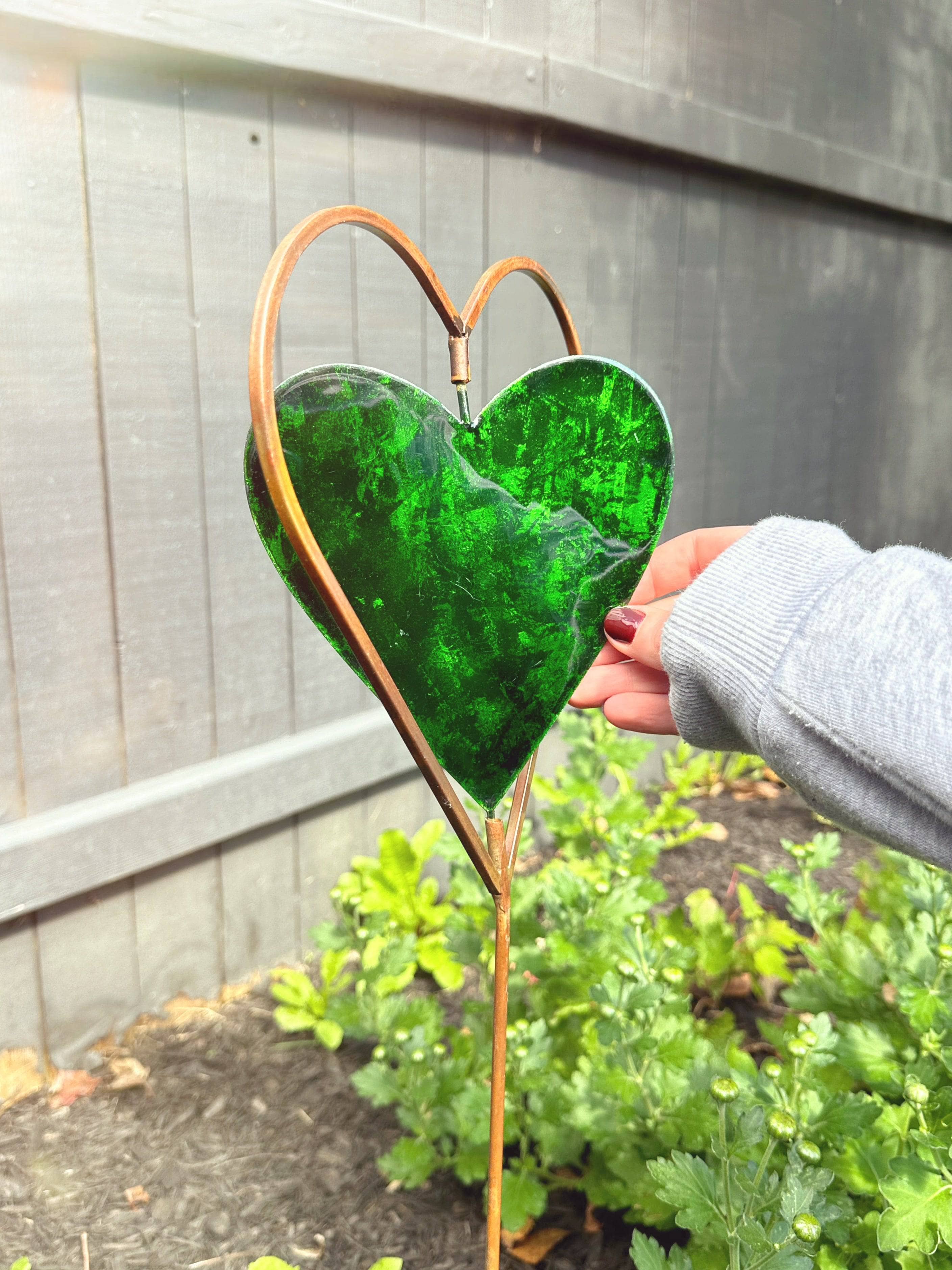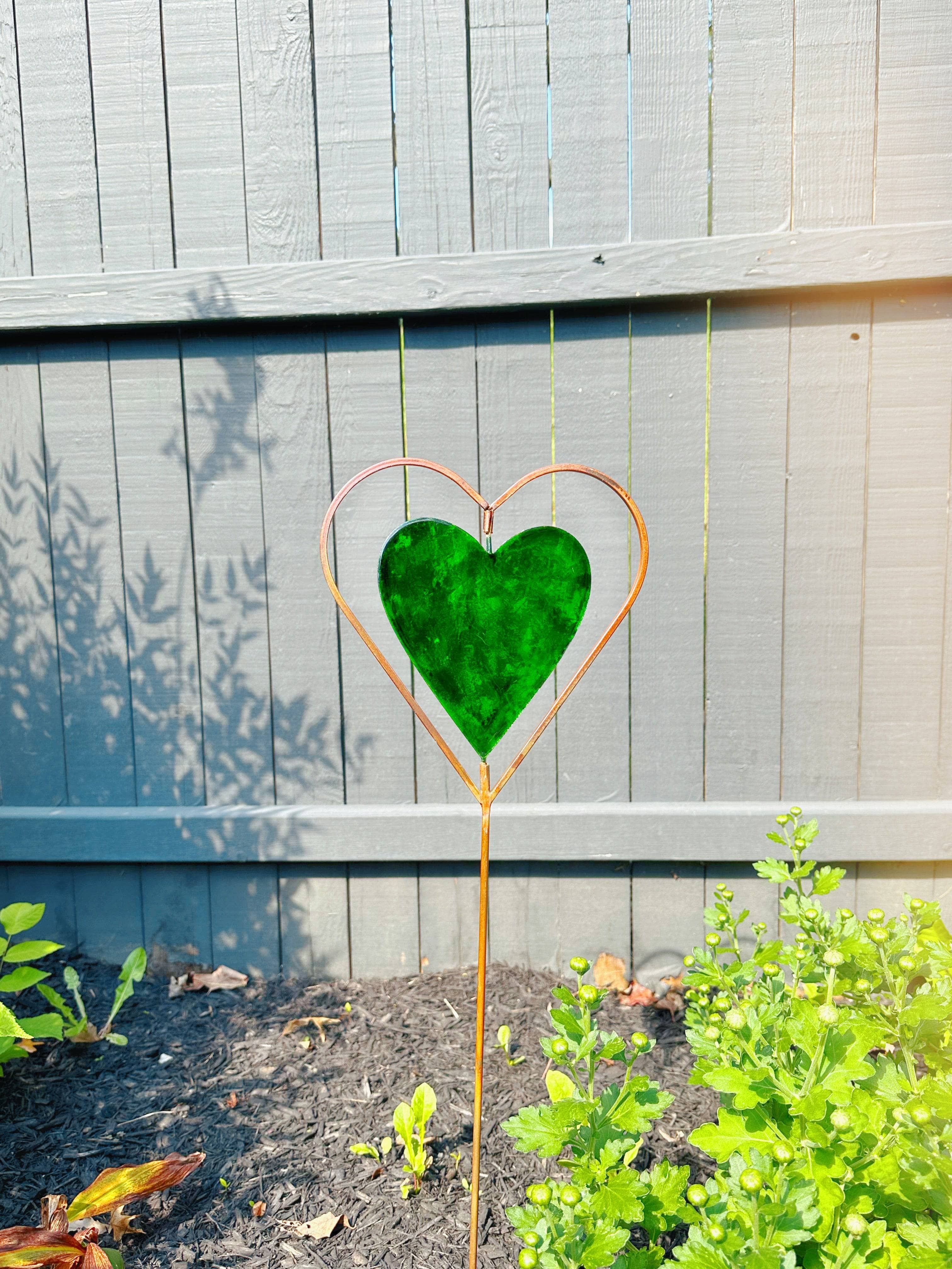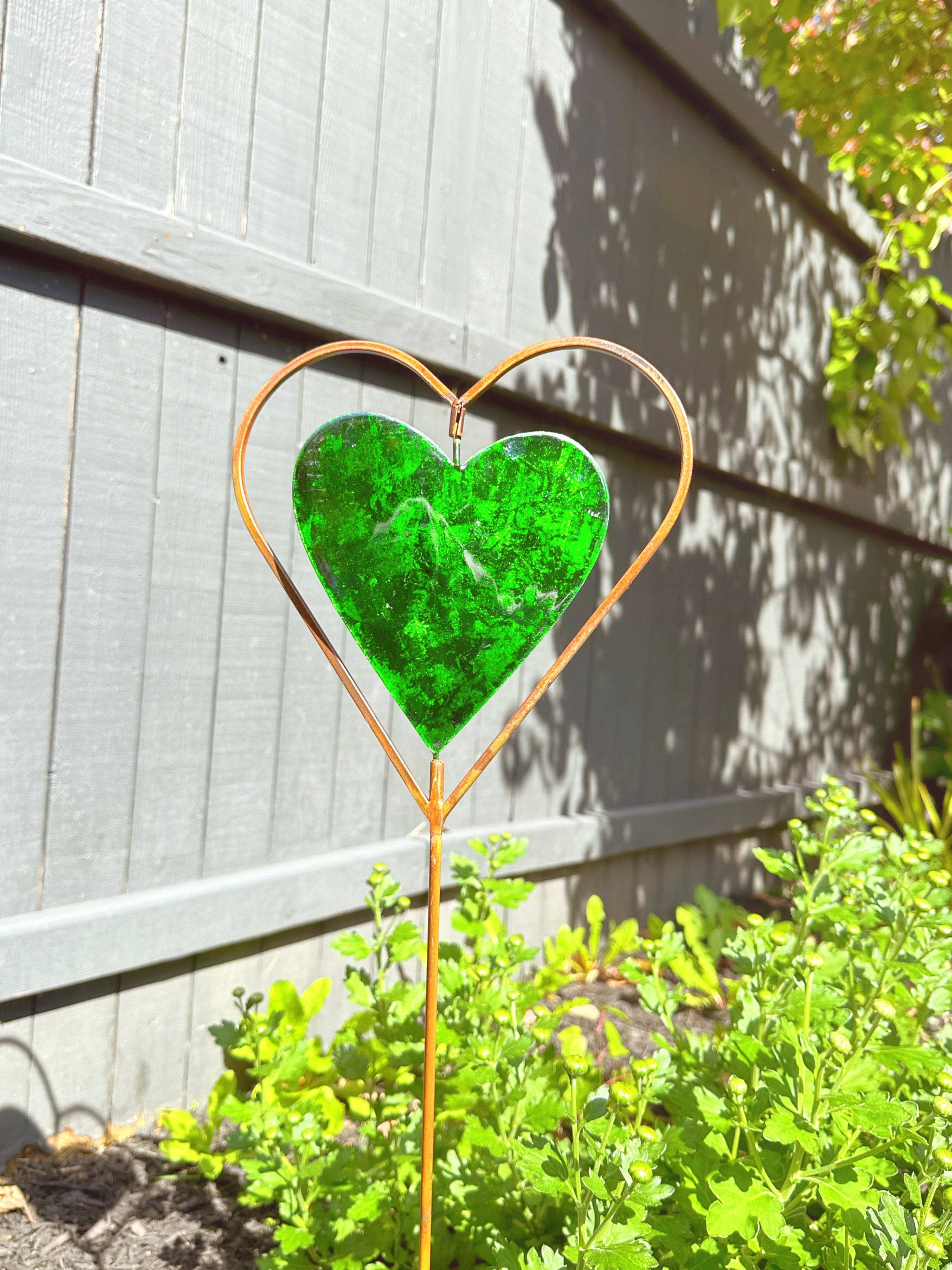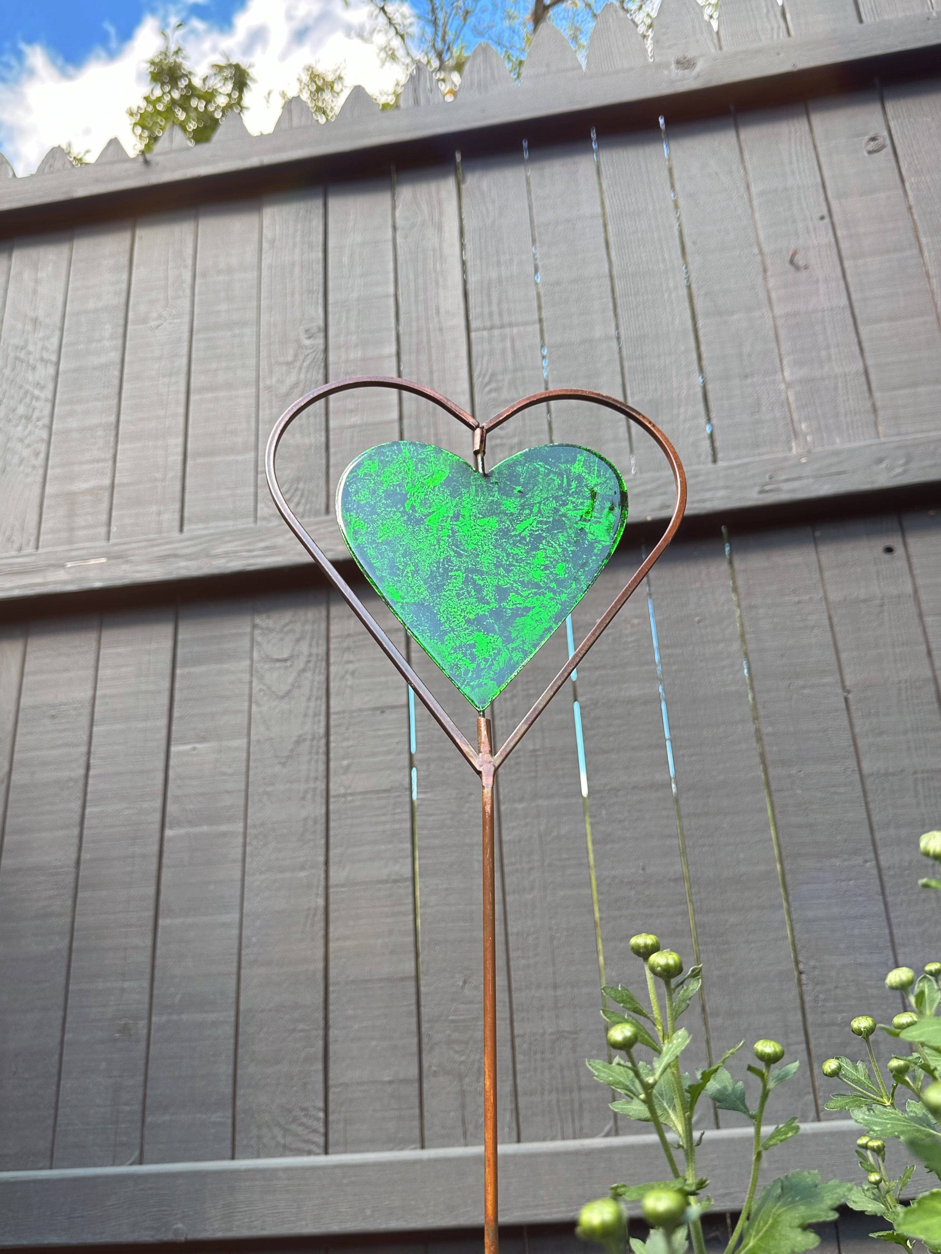 Celebrate your love of the outdoors with our Green Heart Disc Garden Stake! A whimsically enviable piece that blends beautifully with the landscape, it features a colorful central heart surrounded by a frame of contrasting flamed metal. Lovely on its own and even better as part of a larger display, this heart-shaped garden disc makes a fun garden-inspired gift or elevates your own plantings to new heights. Like all Happy Gardens stakes, this one is handcrafted, and brings lasting beauty to your lawn or garden.