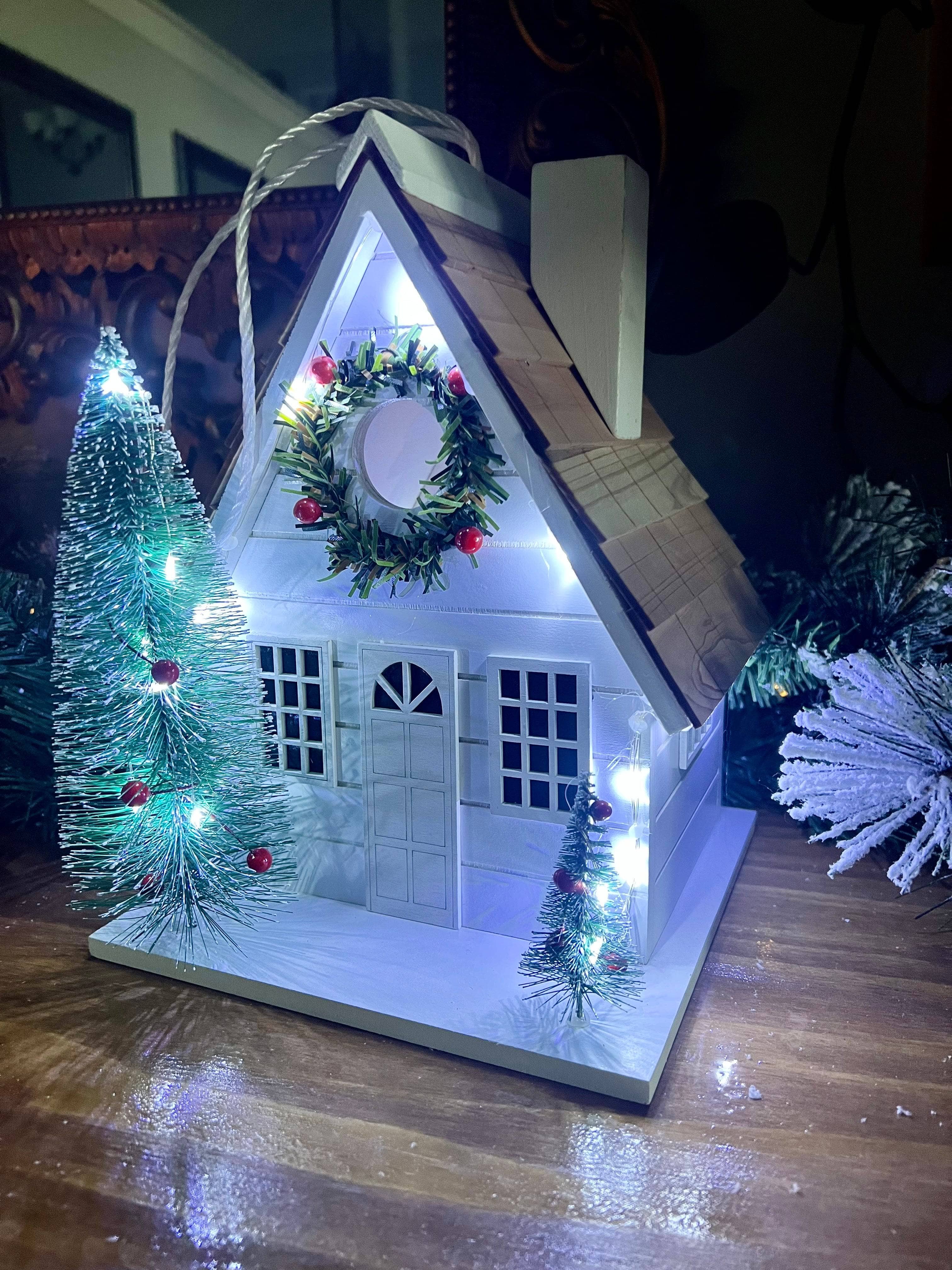 This charming Christmas Chateau birdhouse is decorated with miniature LED Lights, which give the house an inviting warm glow. A Holiday wreath and fir trees adorn the front of the house.