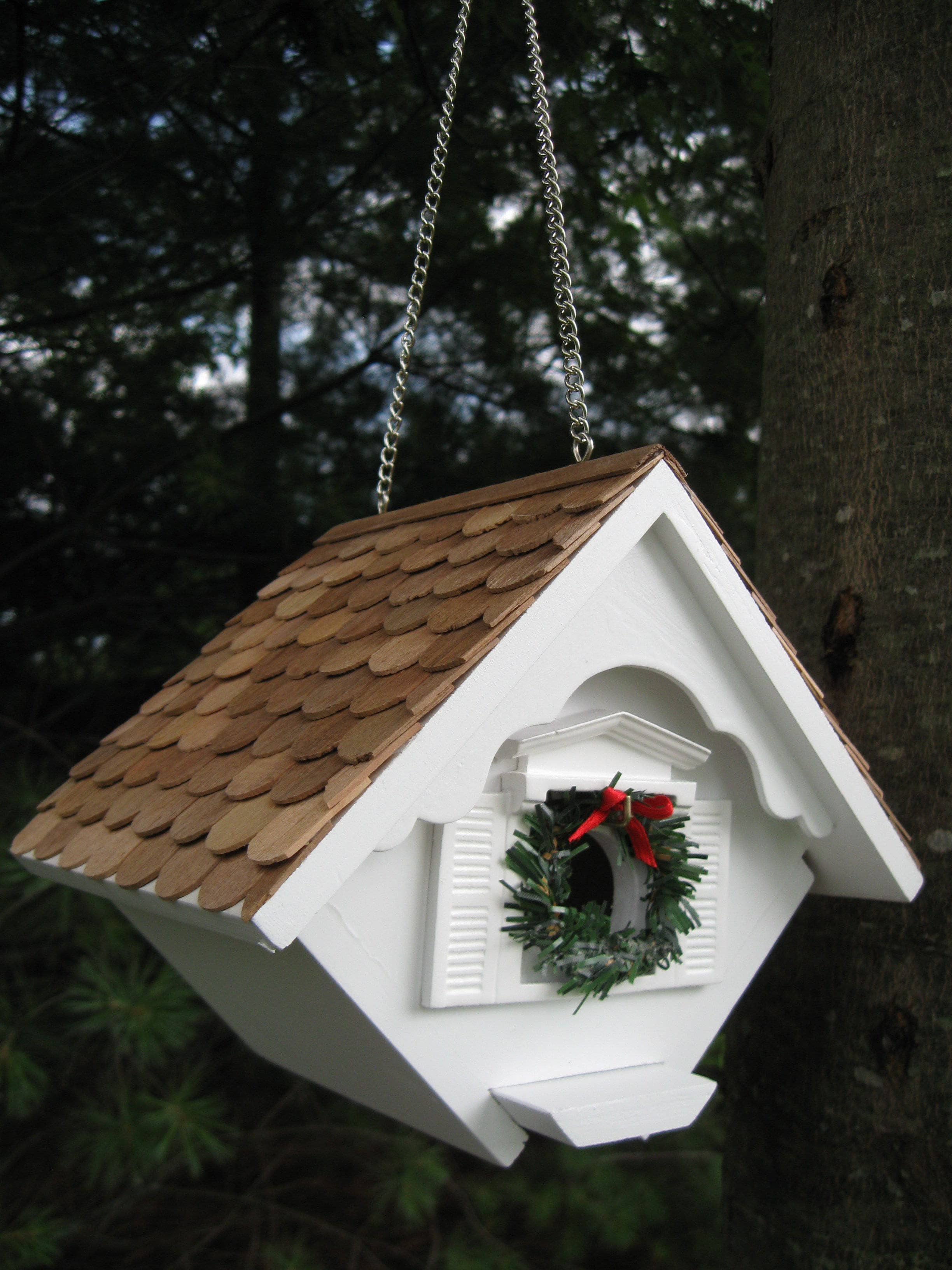 This cheerful holiday hanging birdhouse is designed to accommodate wrens and features a removable wreath detail around the entry hole. Topped with Western Red Cedar shingles and painted with an outdoor paint. Fully functional house has a bottom panel that can be easily removed for yearly cleaning. Sturdy galvanized metal chain.