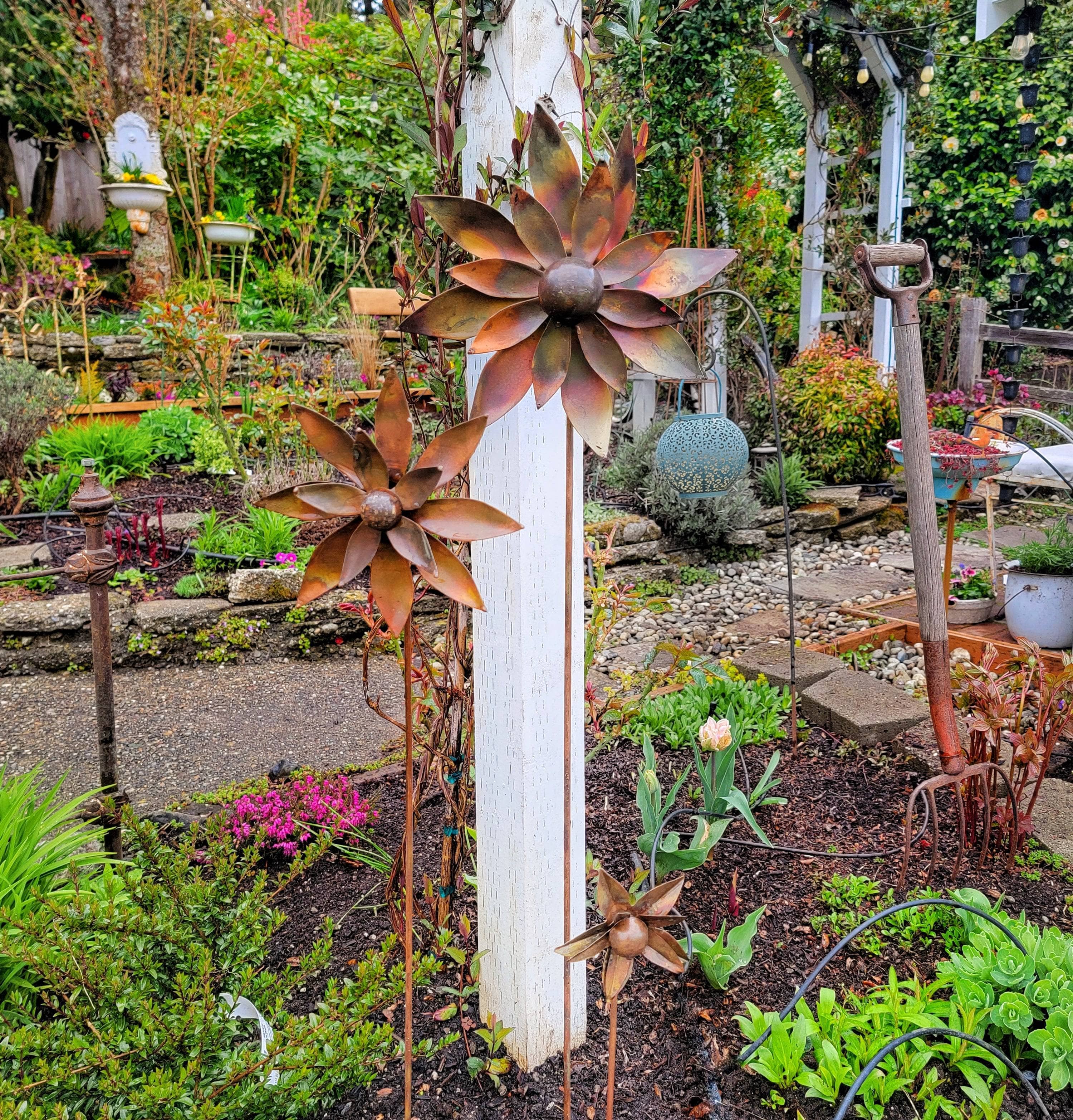 Perfect for displaying alone or in larger groupings, our 12-inch Dahlia Flower Spinner features two lush layers of sculpted petals surrounding a rounded center. A slightly curved stake provides strength while adding a whimsical finishing touch. Simply lovely! Like all Happy Gardens spinners, this one is handcrafted, and will bring lasting beauty to your landscape.